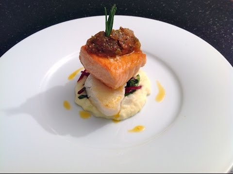 Duett von Dorsch und Lachs auf Topinamburcreme, Mangoldgemüse und Salsa